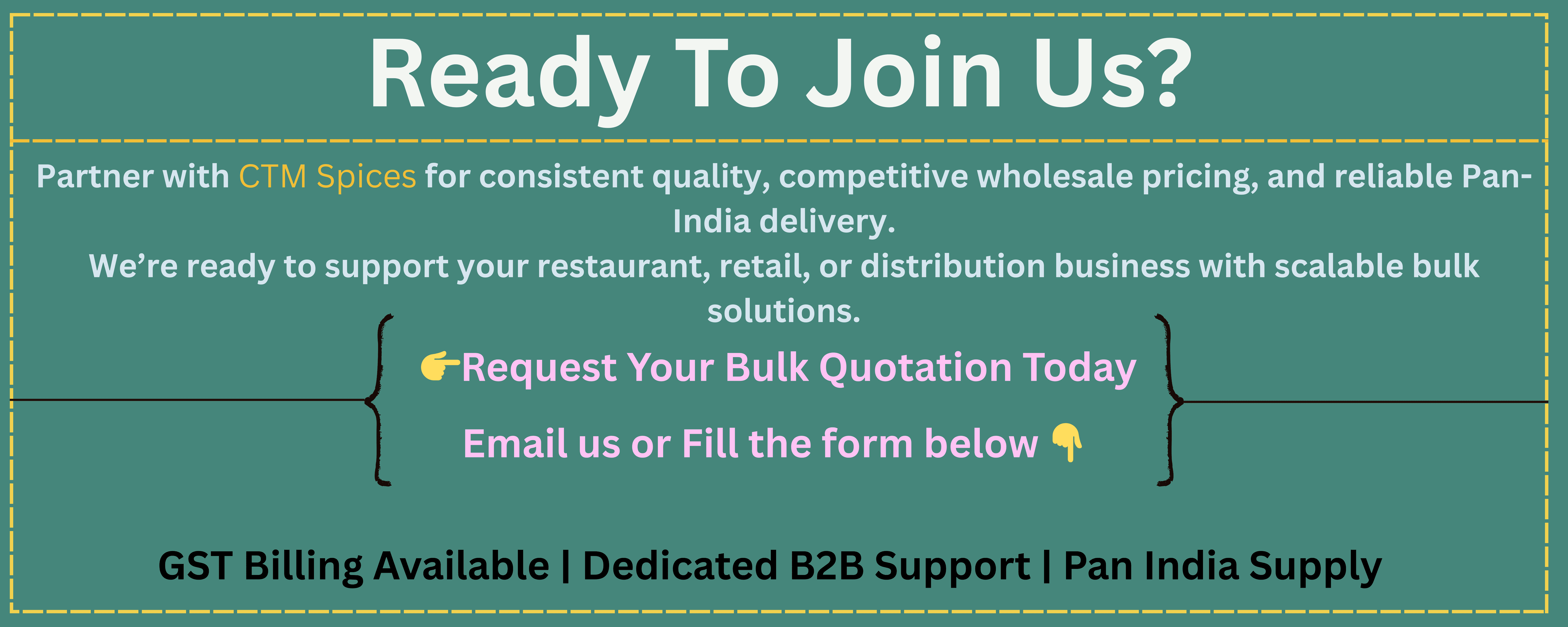 At CTM Spices, we understand that commercial kitchens and retail businesses require consistent taste, reliable availability, and competitive margins. Our operations are structured to support uninterrupted supply and long-term collaboration.