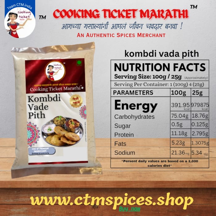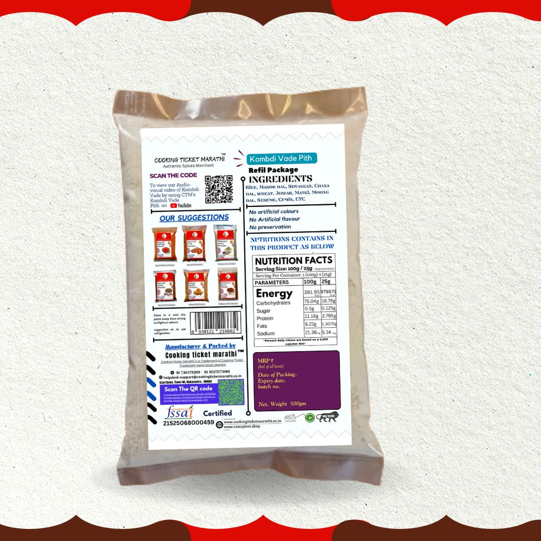Kombdi Vade Pith is a special flour blend, expertly crafted to make delicious Kombdi Vade, a traditional Maharashtrian chicken curry patty. Our Kombdi Vade Pith is a unique blend of flours, carefully mixed to perfection.